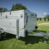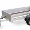 Kippanhänger mit geschweißter V-Deichsel, mechanischer Kippfunktion und praktischer verlängerter und verstärkter befahrbarer Hinterklappe aus Alu-Riffelblech.